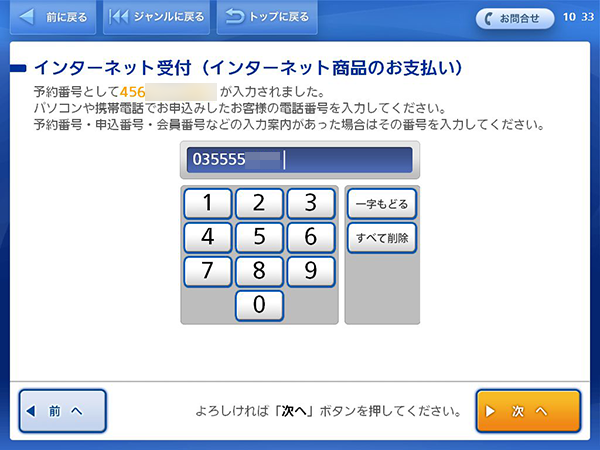 「お申込み時の電話番号/取扱番号」を入力してください。予約番号、申込番号、会員番号などの入力案内がある場合は、その番号を入力してください。