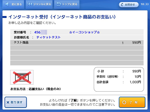 - 店頭レジにて「インターネット支払い」と告げて下さい。お申込み後に通知した「受付番号」を「-」を除いてレジ操作画面で入力してください。